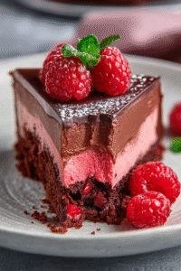 Presenting your delightful Chocolate Raspberry Mousse Cake can elevate its appeal further! Before serving chilled slices straight from refrigerator… consider dusting powdered sugar lightly over top alongside some extra fresh raspberries arranged artistically nearby! A sprig mint leaves placed strategically adds freshness visually alongside creating enticing aroma wafting through air enticing everyone around!
